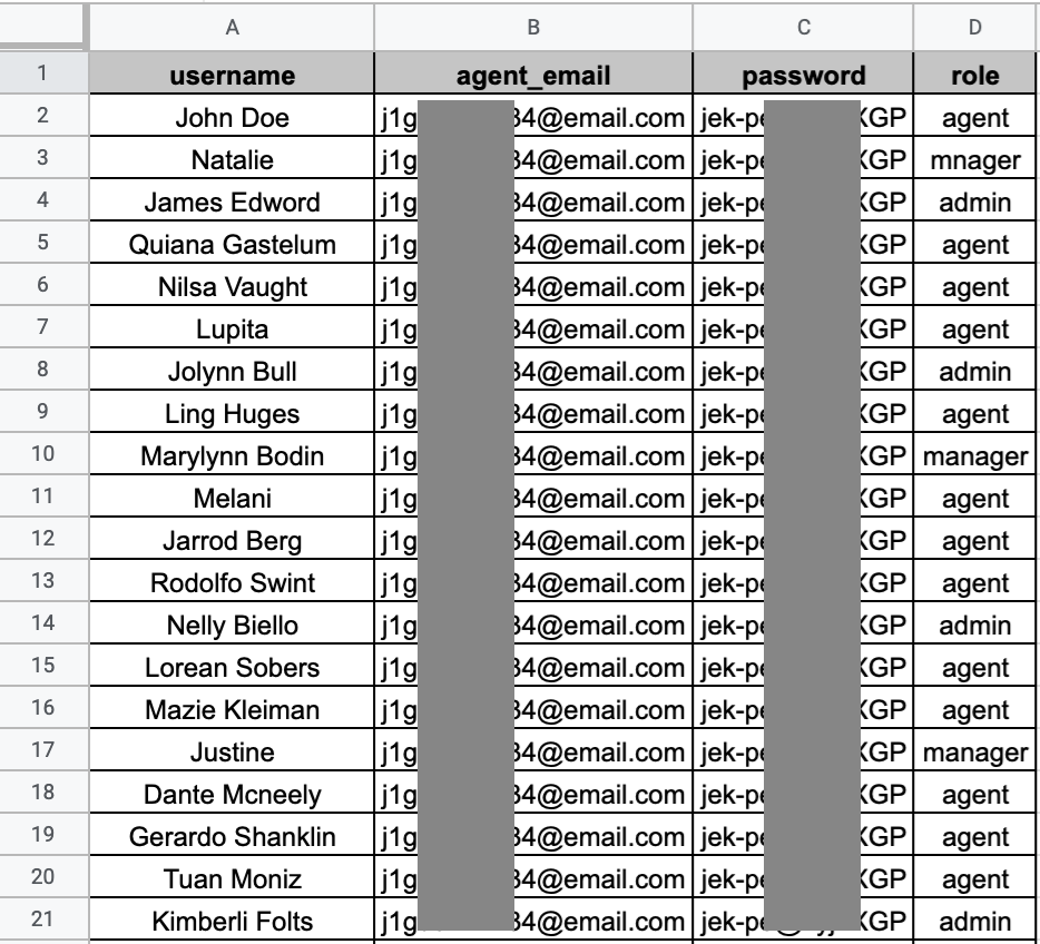 The fourth column "role" is optional. If not specified, the role "agent" is applied to all the users.
