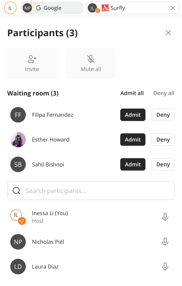 The sidebar also contains the list of people in the Waiting Room. This allows the active Host to make sure that only the right participants will be able to attend the active session in this Space.
