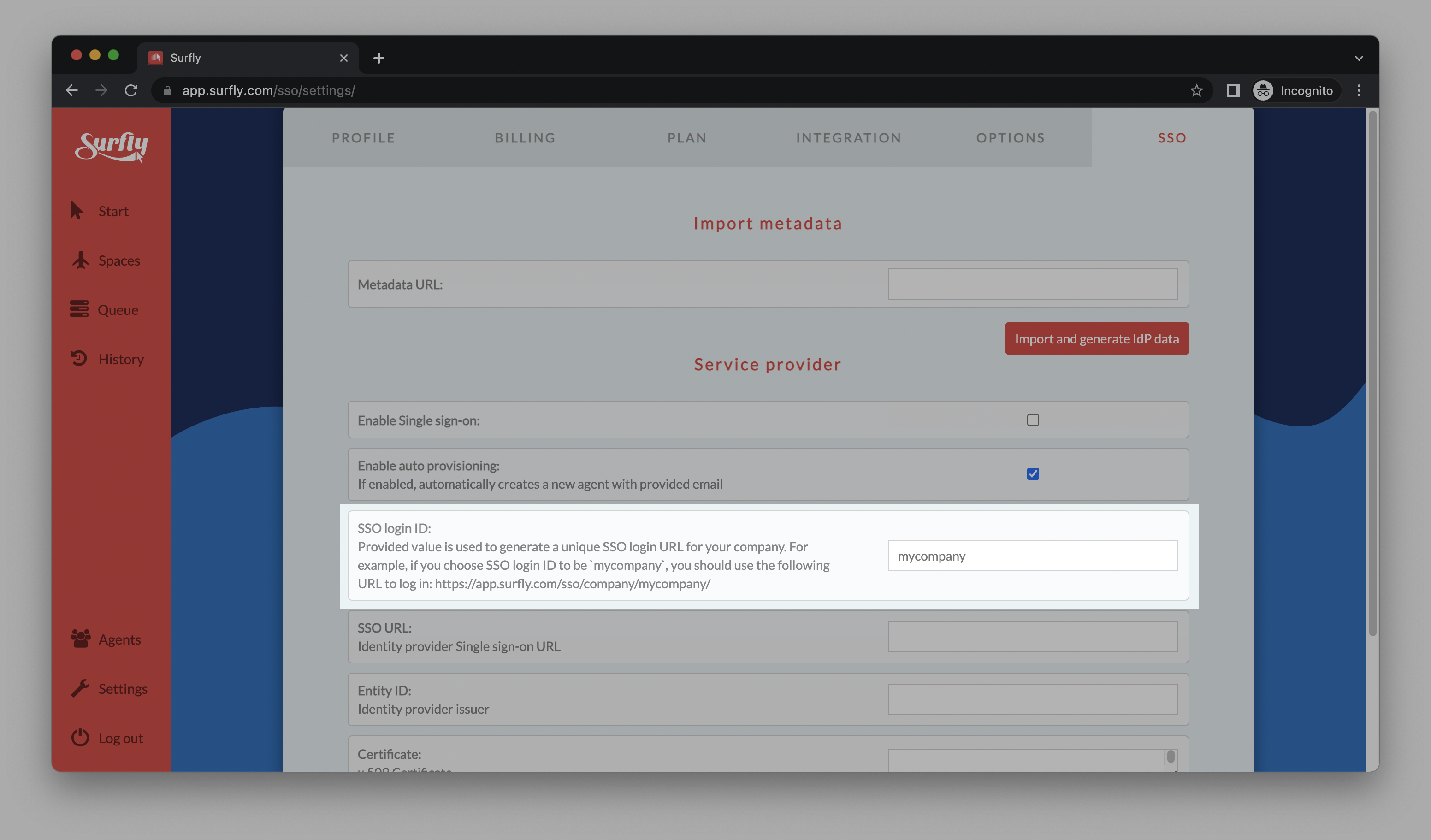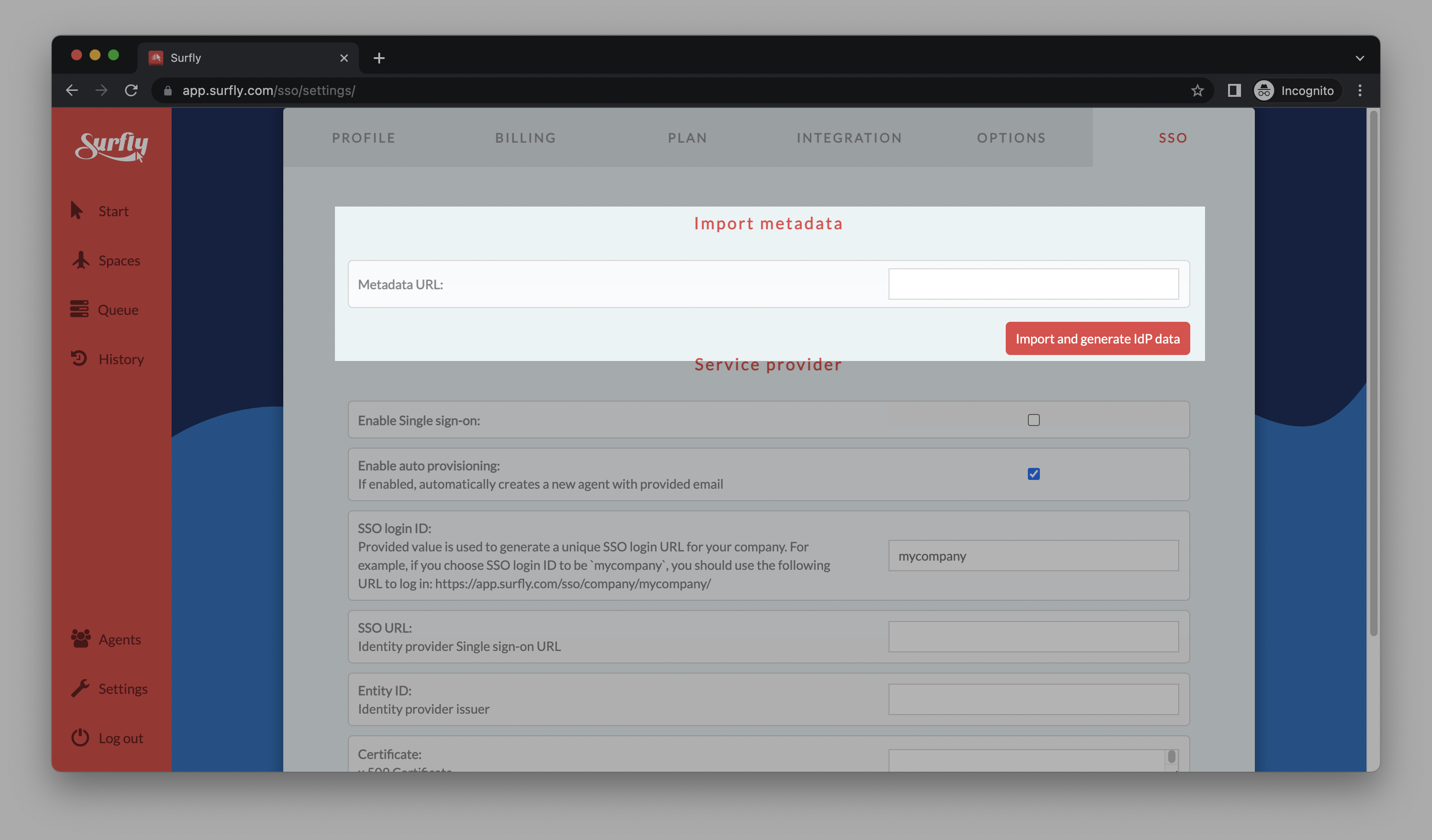 Log in to the Surfly Dashboard and navigate to Settings > SSO. Here, you can provide the IdP metadata URL to import the IdP metadata for SSO.