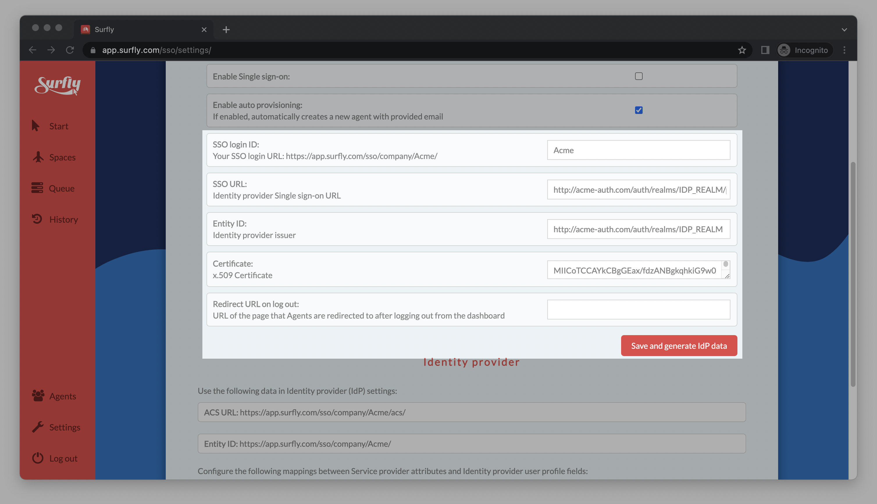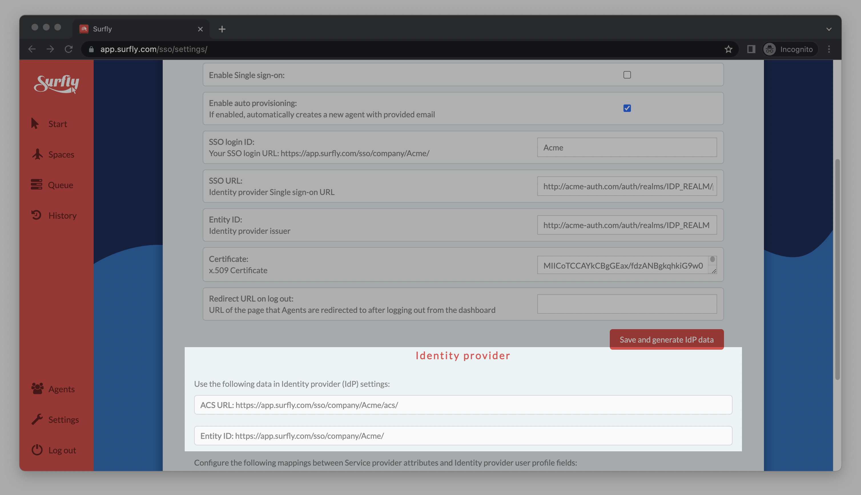 Save and generate IdP data.Once you have completed this configuration, you will be able to retrieve Entity ID and the ACS (Assertion Consumer Service) URL. Enter it as the Assertion Consumer Service POST Binding URL in the IDP configuration.